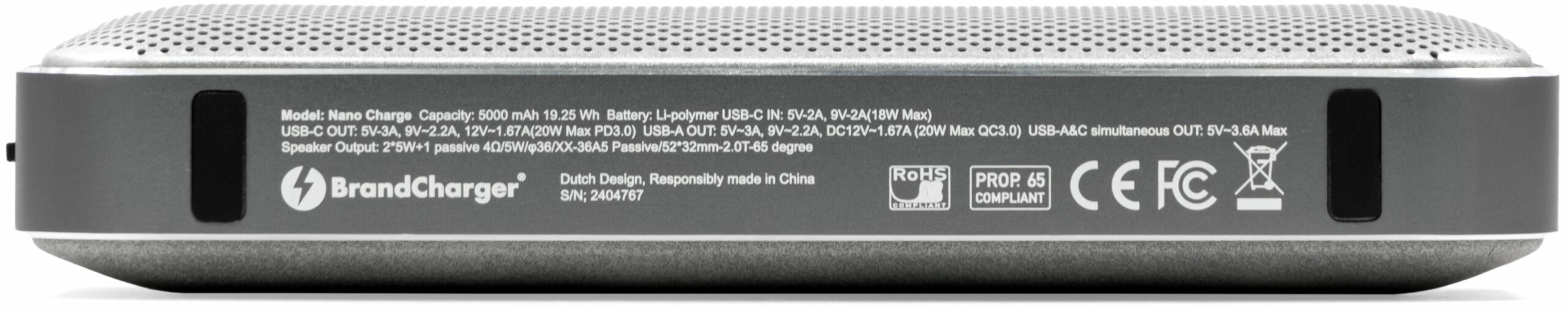 1233560 | BrandCharger Nano Charge es un altavoz inalámbrico compacto y una batería externa portátil, ideal para transportarlo cómodamente. Incorpora un sistema Ambient Harmonics™ de doble controlador de 10 W para un sonido nítido y una batería externa integrada de 5000 mAh con carga rápida de hasta 20 W (compatible con PD3.0 y QC3.0). Incluye elegantes botones de aluminio para pausar, reproducir y controlar el volumen. Equipado con conexión Bluetooth y USB-C. Ideal para profesionales en movimiento.