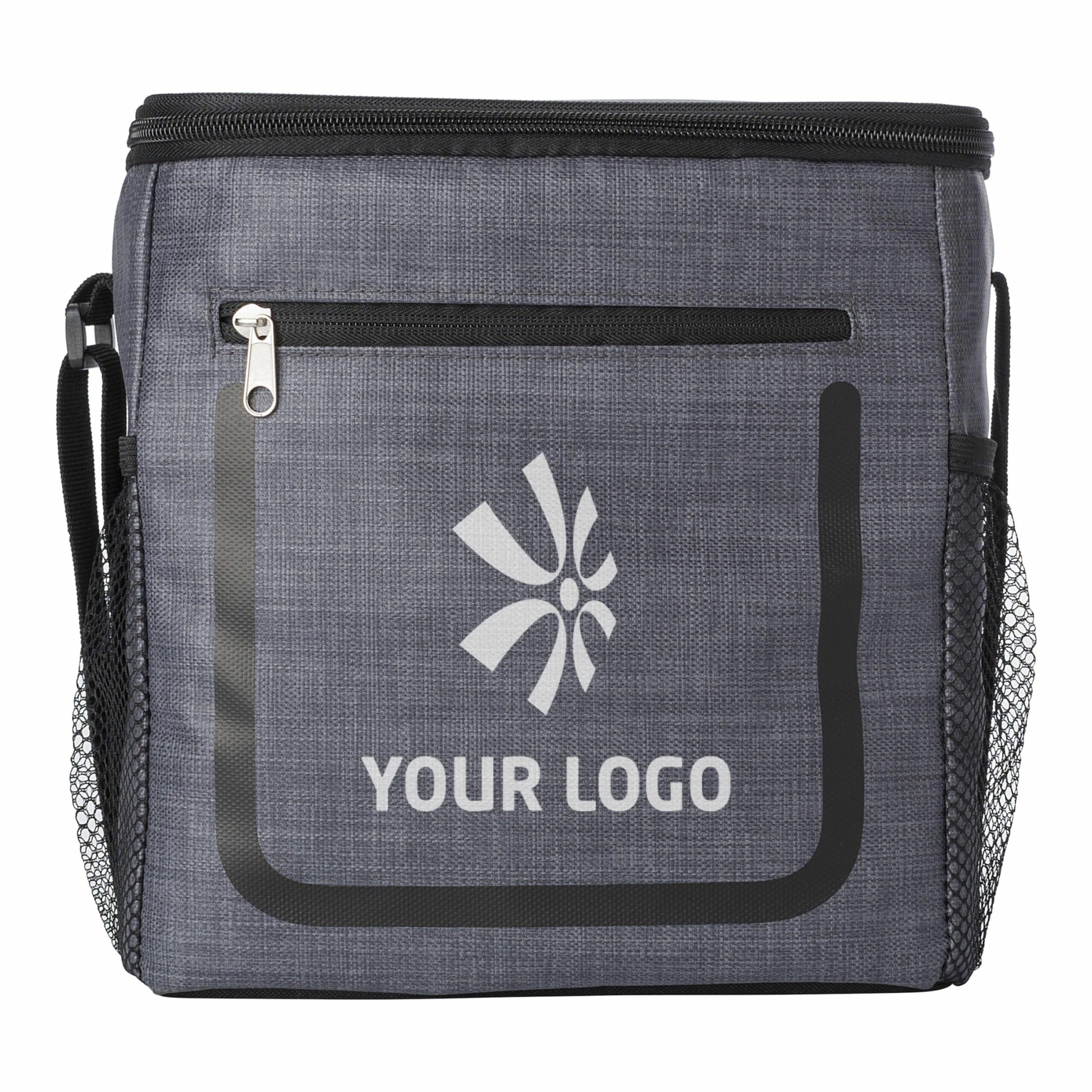 8836 | Bolsa isotérmica de PU con bolsillo frontal con cremallera y compartimentos de red en los laterales. El interior va forrado de papel de aluminio blanco. Tiene una correa ajustable.
