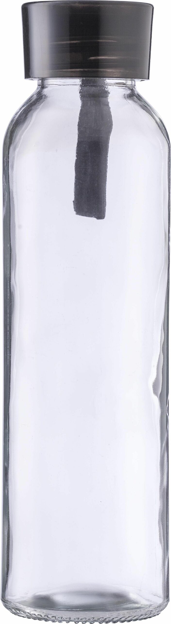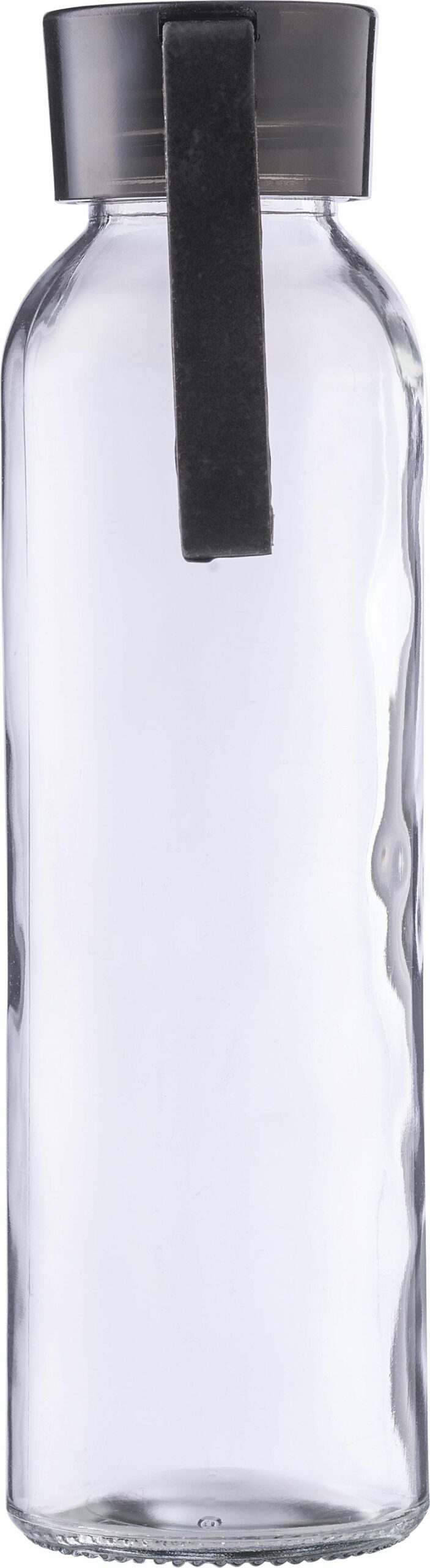 1014889 | Botella de cristal (500 ml) con tapón de PS y correa de silicona a juego. Presentada en una caja de cartón marrón. Recomendable para uso de agua fría. Evitar bebidas ácidas o con gas.