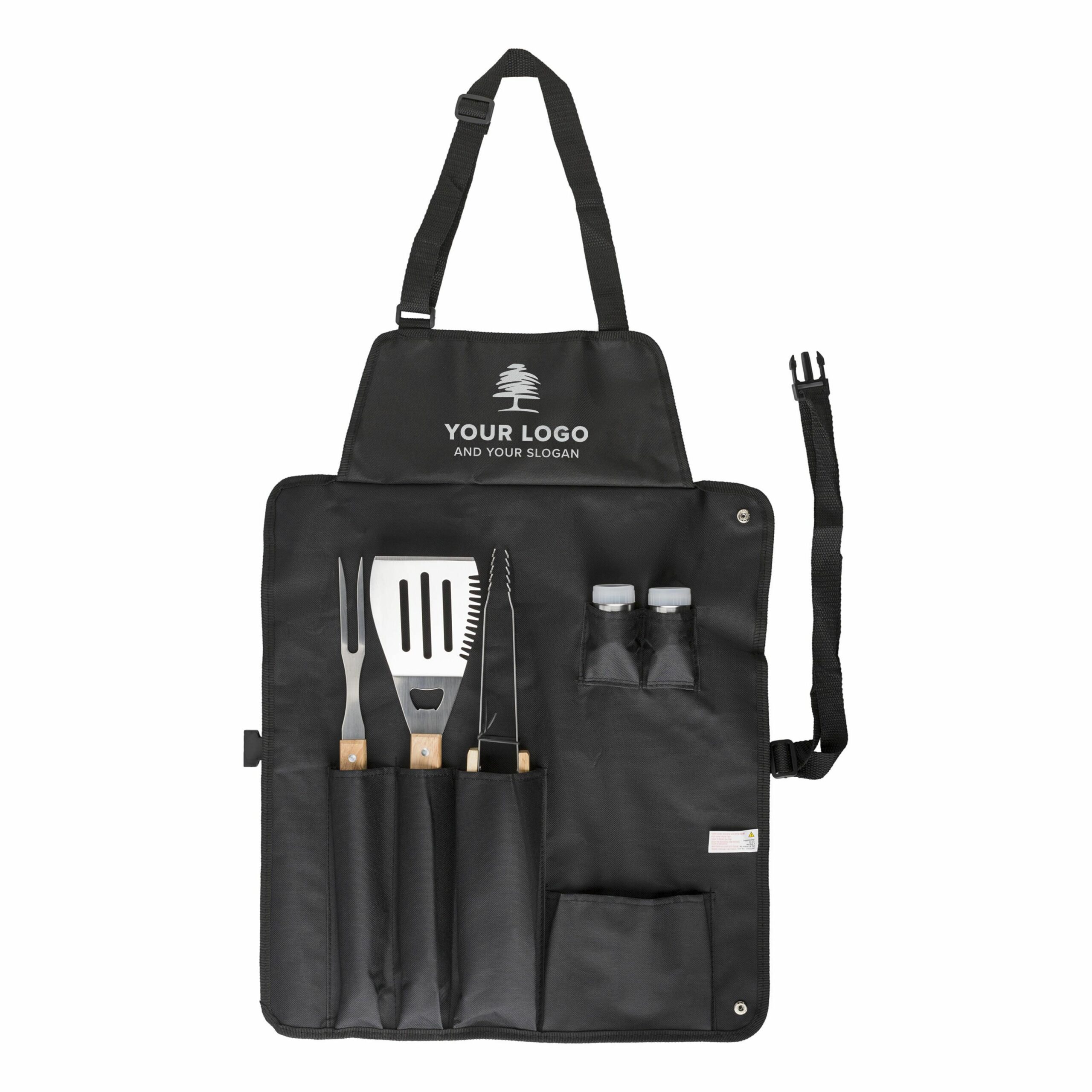2631 | Set de 6 utensilios para barbacoa, de acero inoxidable: Delantal de nilón negro (600 D), tenedor, espátula, pinzas, salero y pimentero.