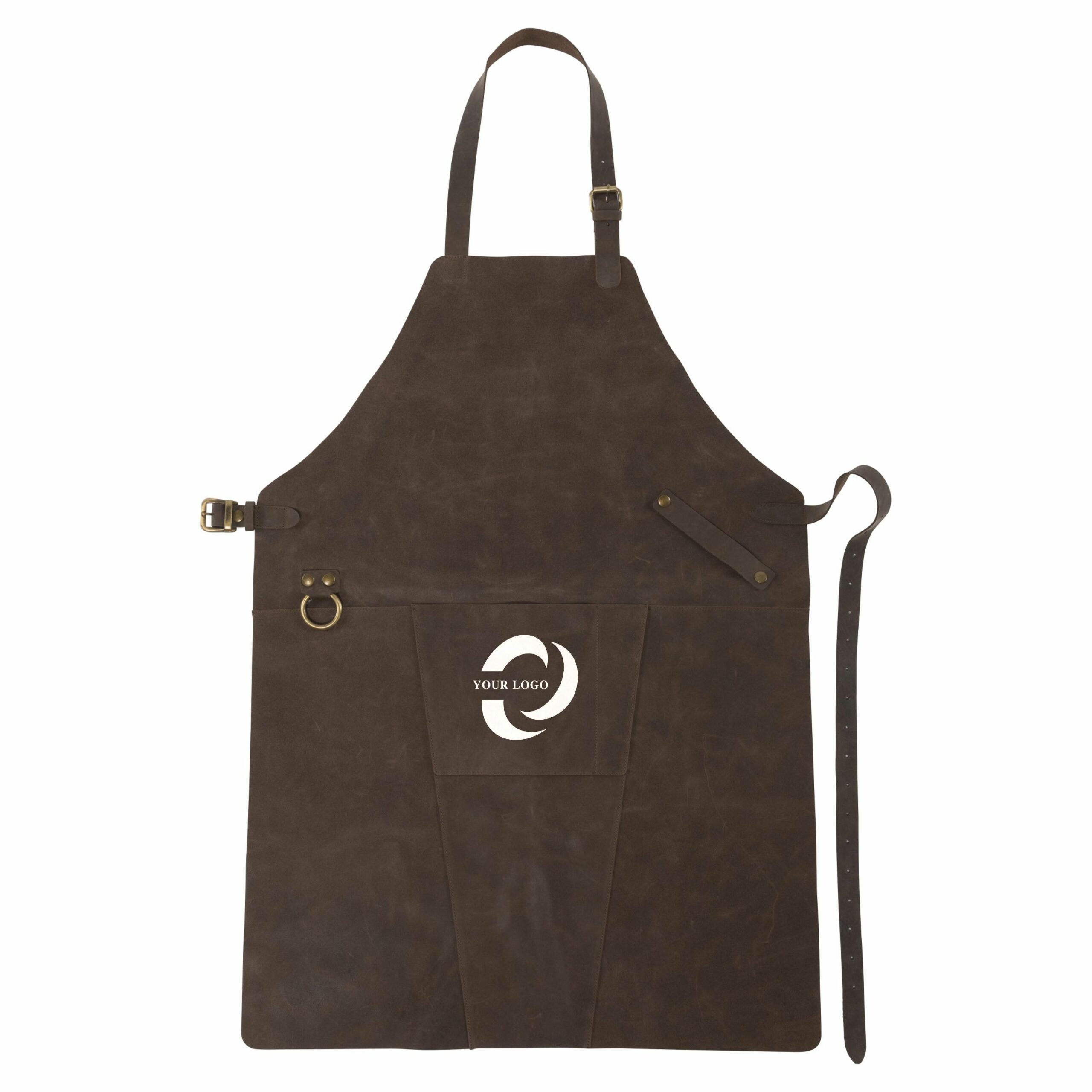 8066 | Delantal de cuero de alta calidad. Con cintas ajustables, bolsillo central y una anilla metálica.