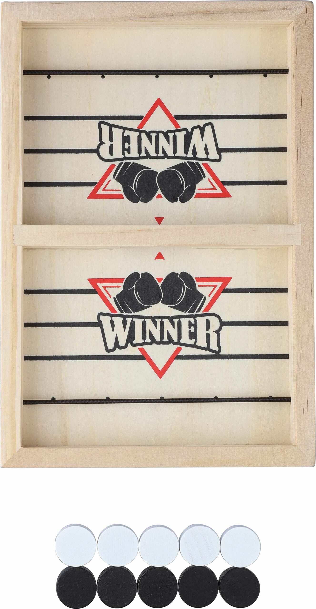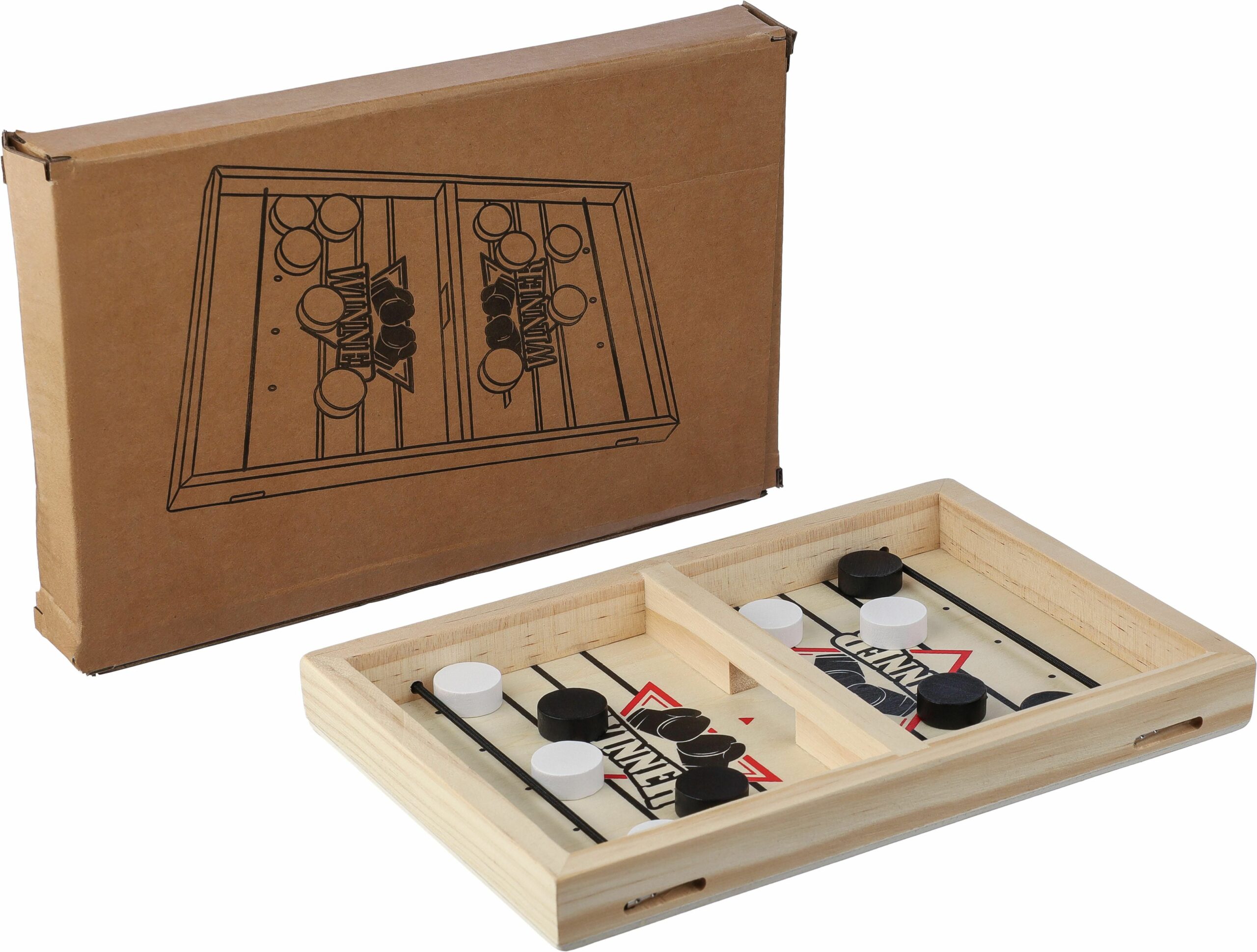 1267534 | Juego de expulsión de madera. Incluye 10 fichas de ajedrez (5 blancas y 5 negras) y un manual para facilitar la configuración y el juego. Un juego de habilidad trepidante para adultos con un total de 11 piezas. Presentado en una caja de cartón marrón con portada ilustrada.
