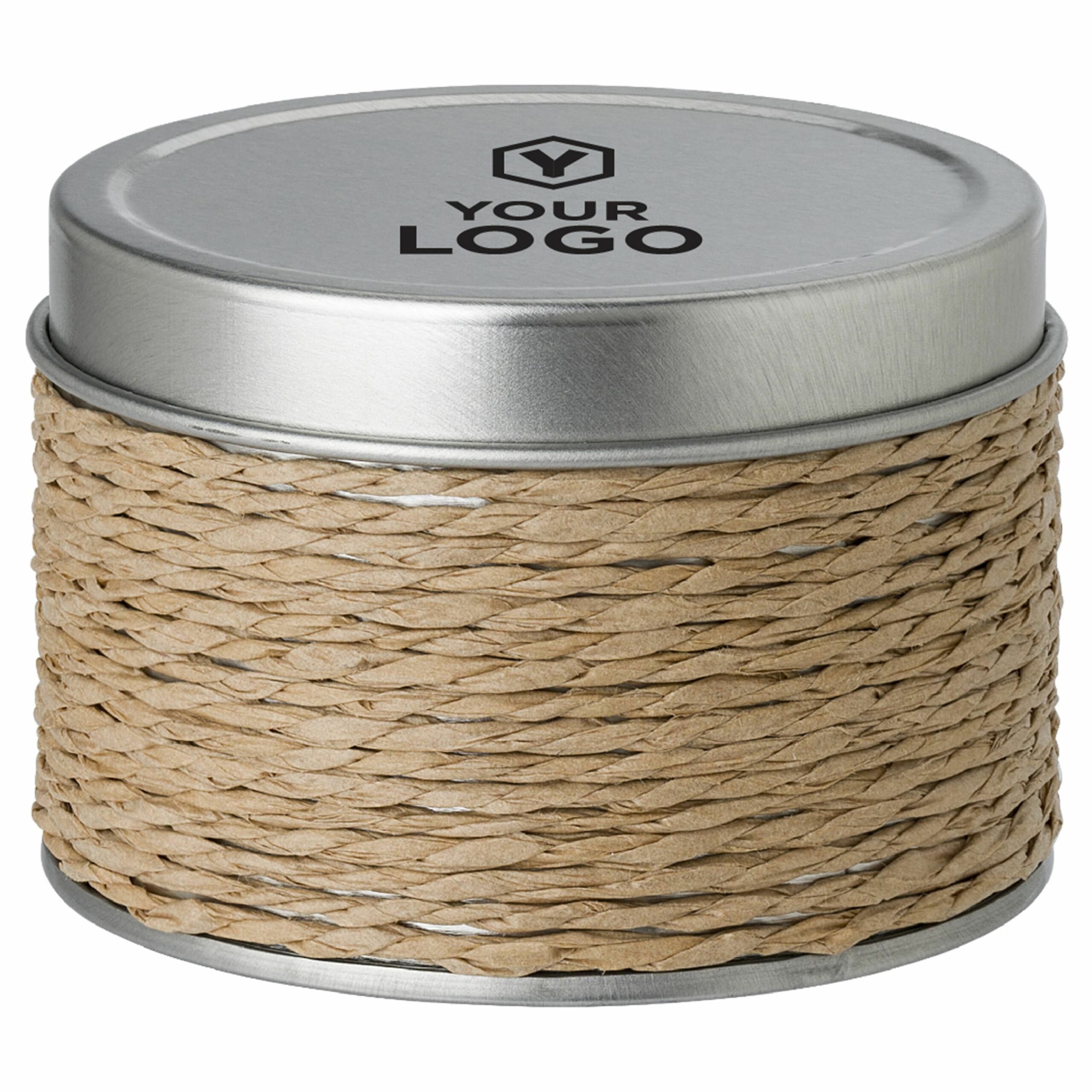 1361 | Vela perfumada en latita metálica y adorno de cuerdas a juego. Aromas: (02) vainilla, (08) Manzana y Canela, (13) canela.