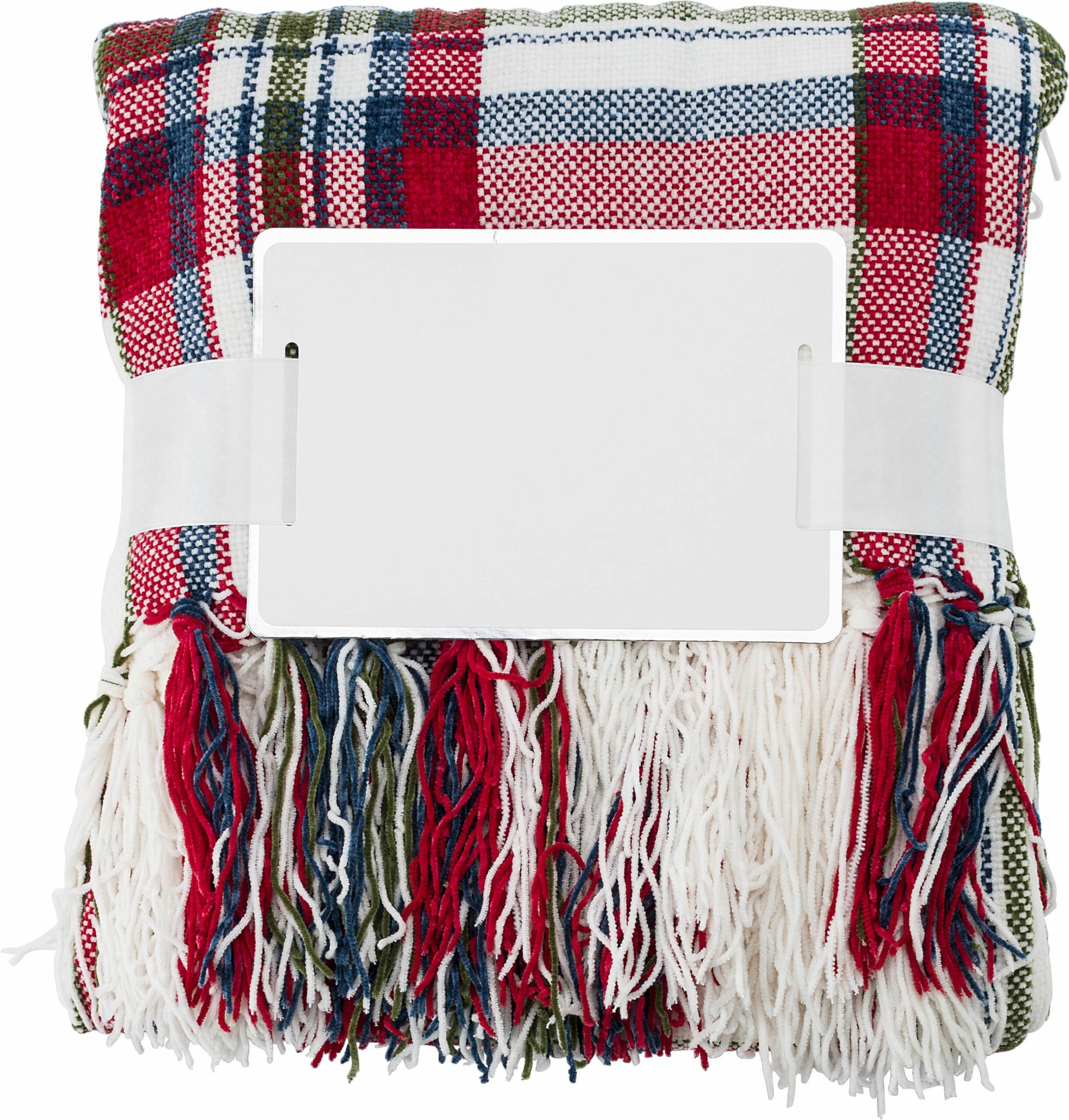 8186 | Manta de chenilla de poliéster (285 gr/m²) extrasuave, de 120 x 150 cm. Flecos en los laterales cortos. Se presenta doblada y con una cinta cerrada con velcro y cartón para imprimir.