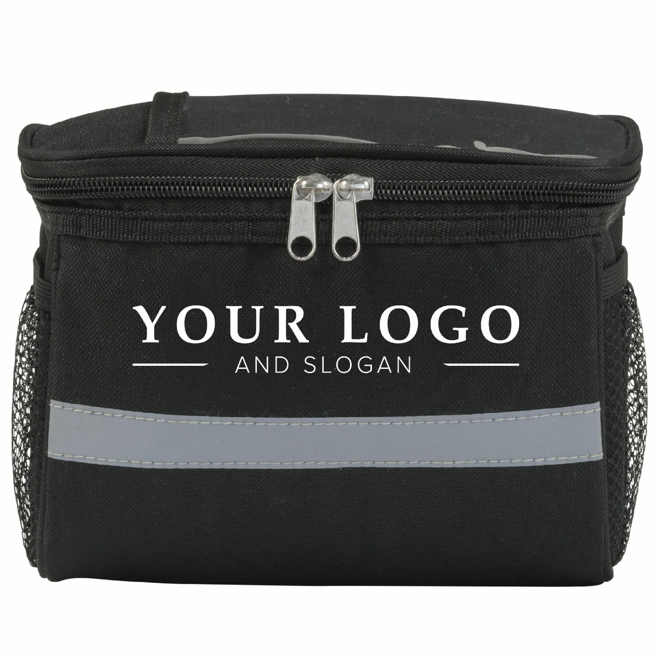 0929 | Bolsa isotérmica para bicicleta de poliéster (600 D) con interior recubierto de PEVA. En la parte superior tiene un bolsillo de PVC para el móvil. Incluye banda reflectante en la parte frontal y bolsillos de malla a los lados. Cierre de cremallera.