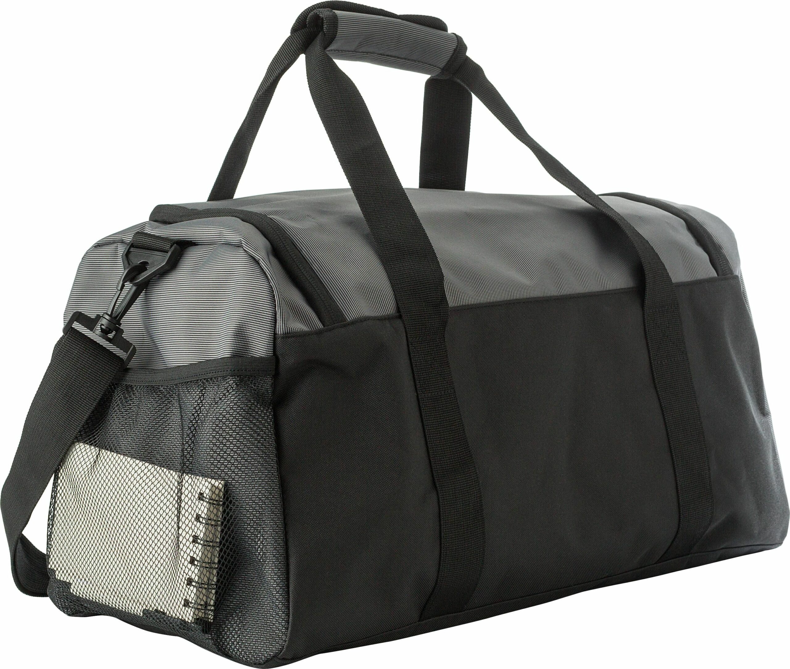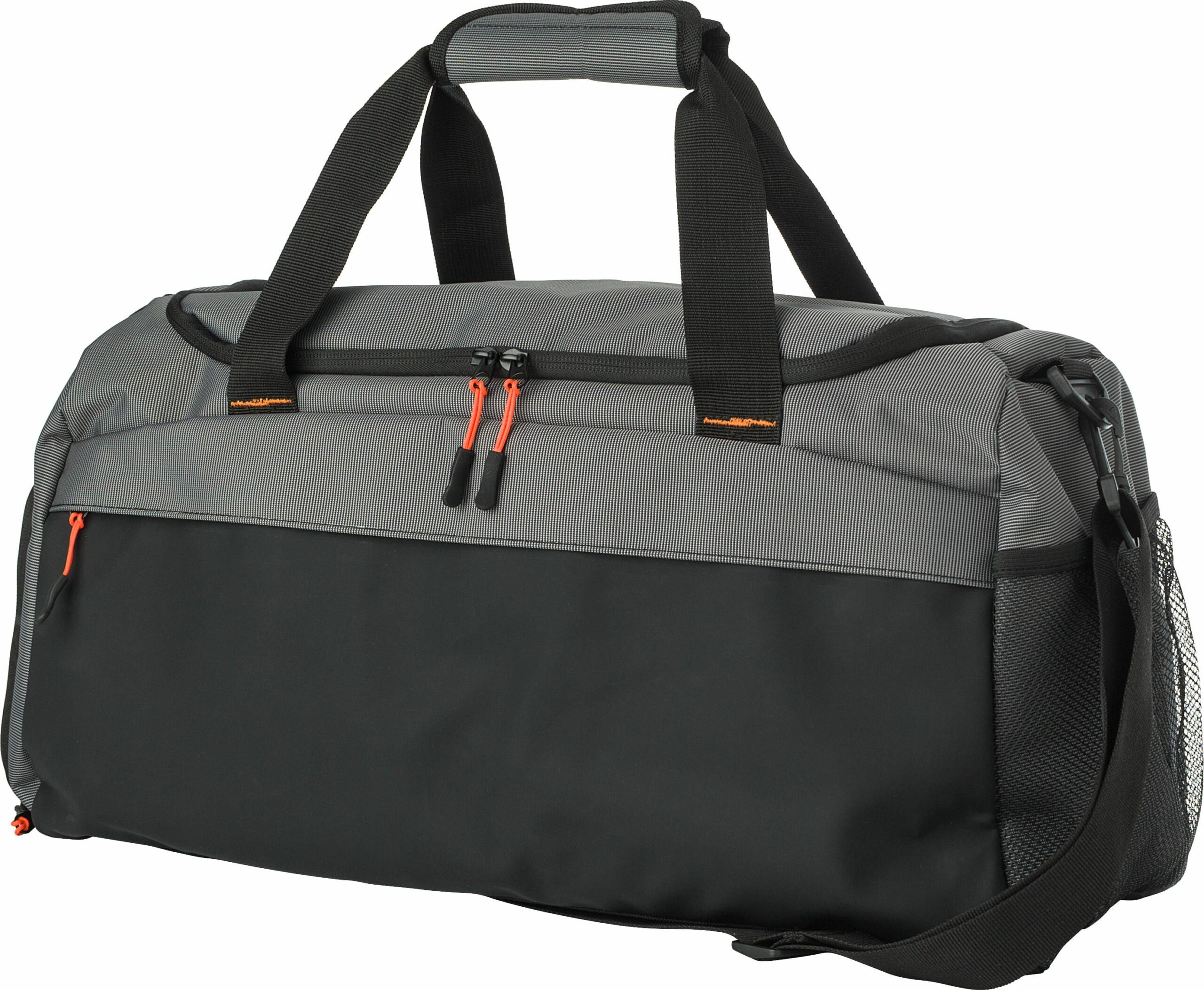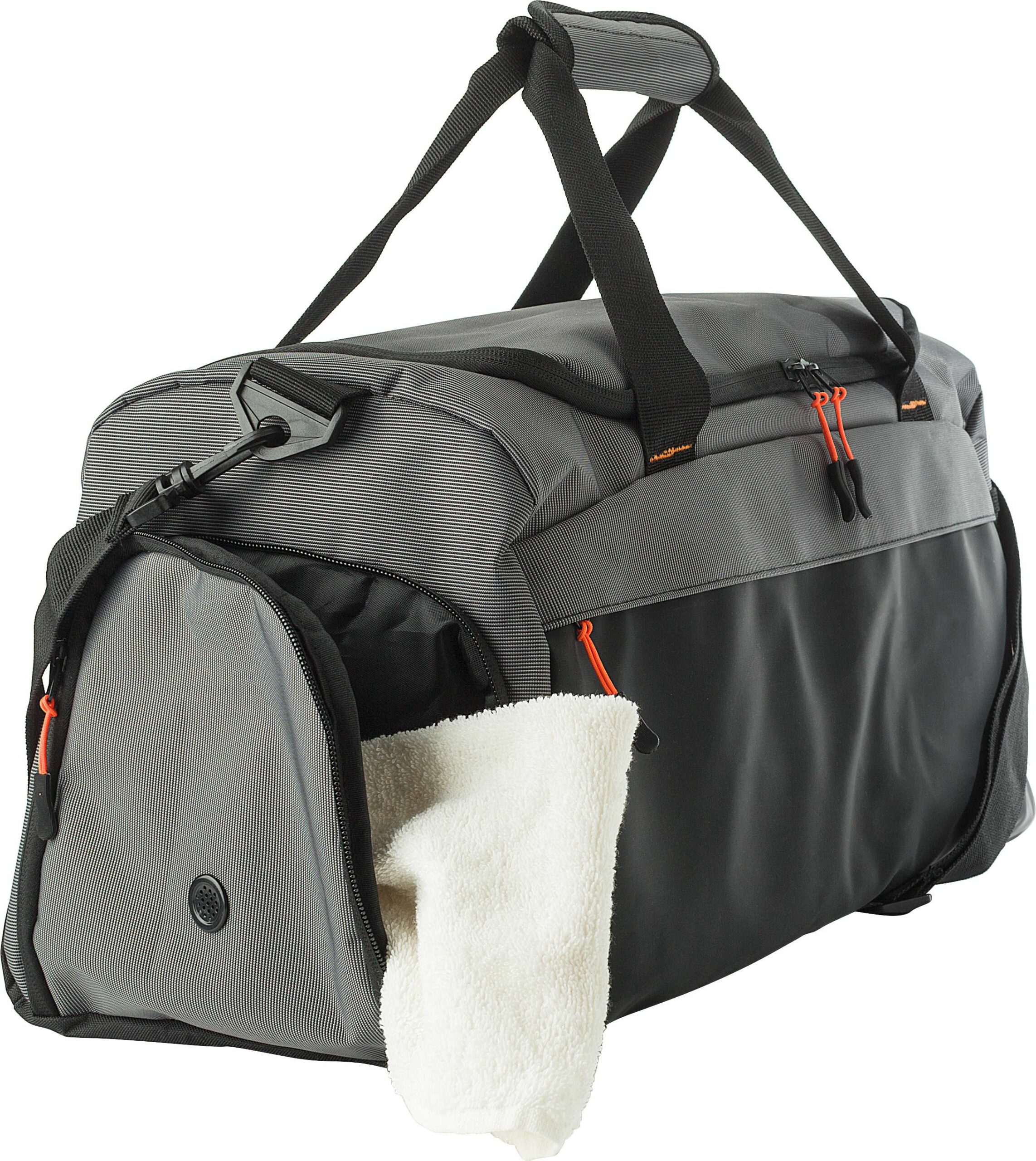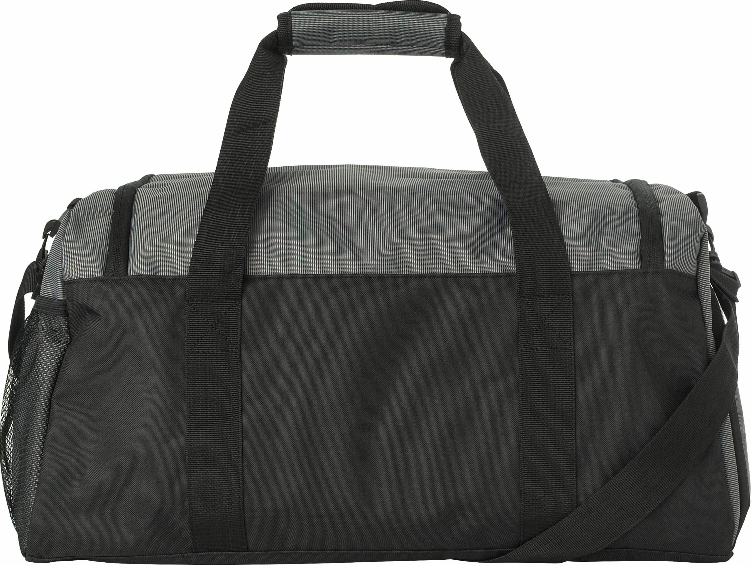 1041619 | Bolsa de lona bicolor de 500D con un gran compartimiento principal con fondo reforzado. Tiene un bolsillo frontal con cremallera, un compartimento lateral ventilado para zapatos, y un bolsillo de malla en el lado opuesto. Asas cortas con cierre de velcro.
