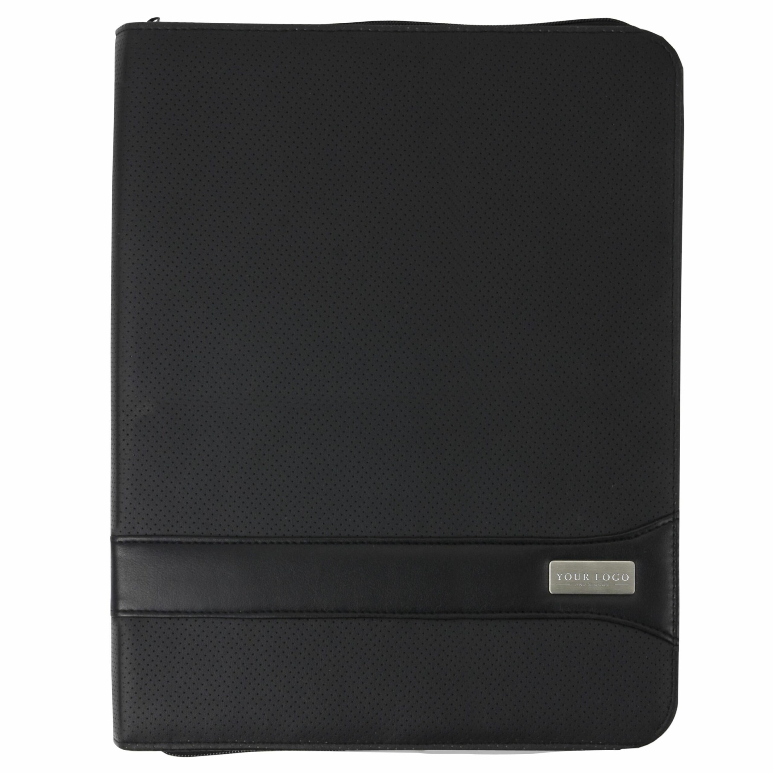 3403 | CarPETa de congresos (aprox. A4) con cremallera. De PVC, con dos grandes bolsillos interiores y cuatro bolsillos pequeños para tarjetas. Incluye portabolígrafos y bloc de notas de 30 hojas lineadas. Placa para personalizar. Bolígrafo no incluido.