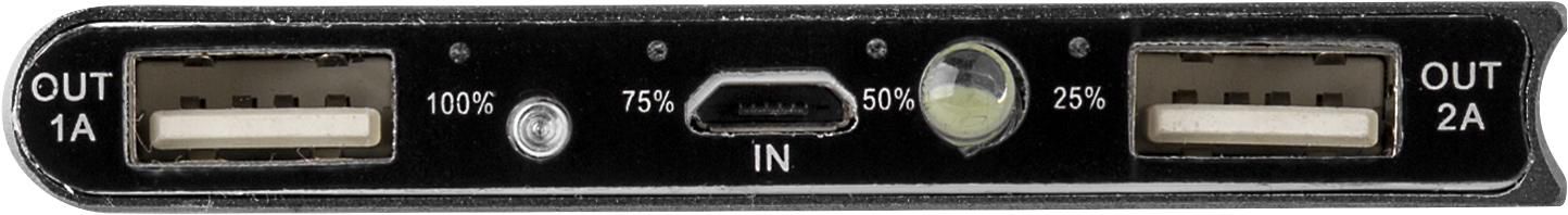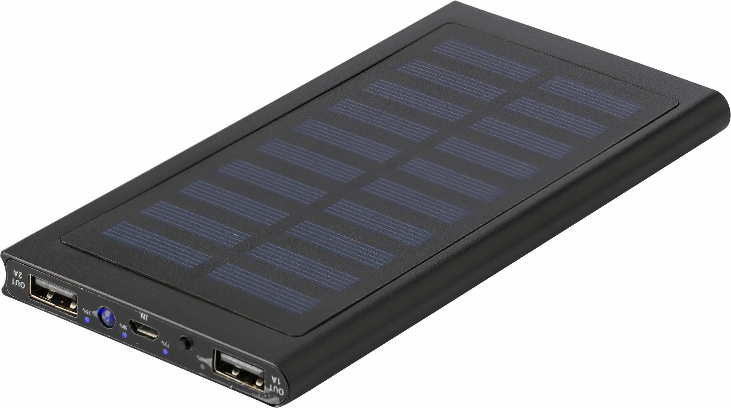 9150 | Power Bank solar de ABS y aluminio, 8.000 mAh. Entrada DC5V / 1A. Salida: DC5V / 1A y DC5V / 2.1A. Con puerto USB y cable de carga de USB -micro USB.