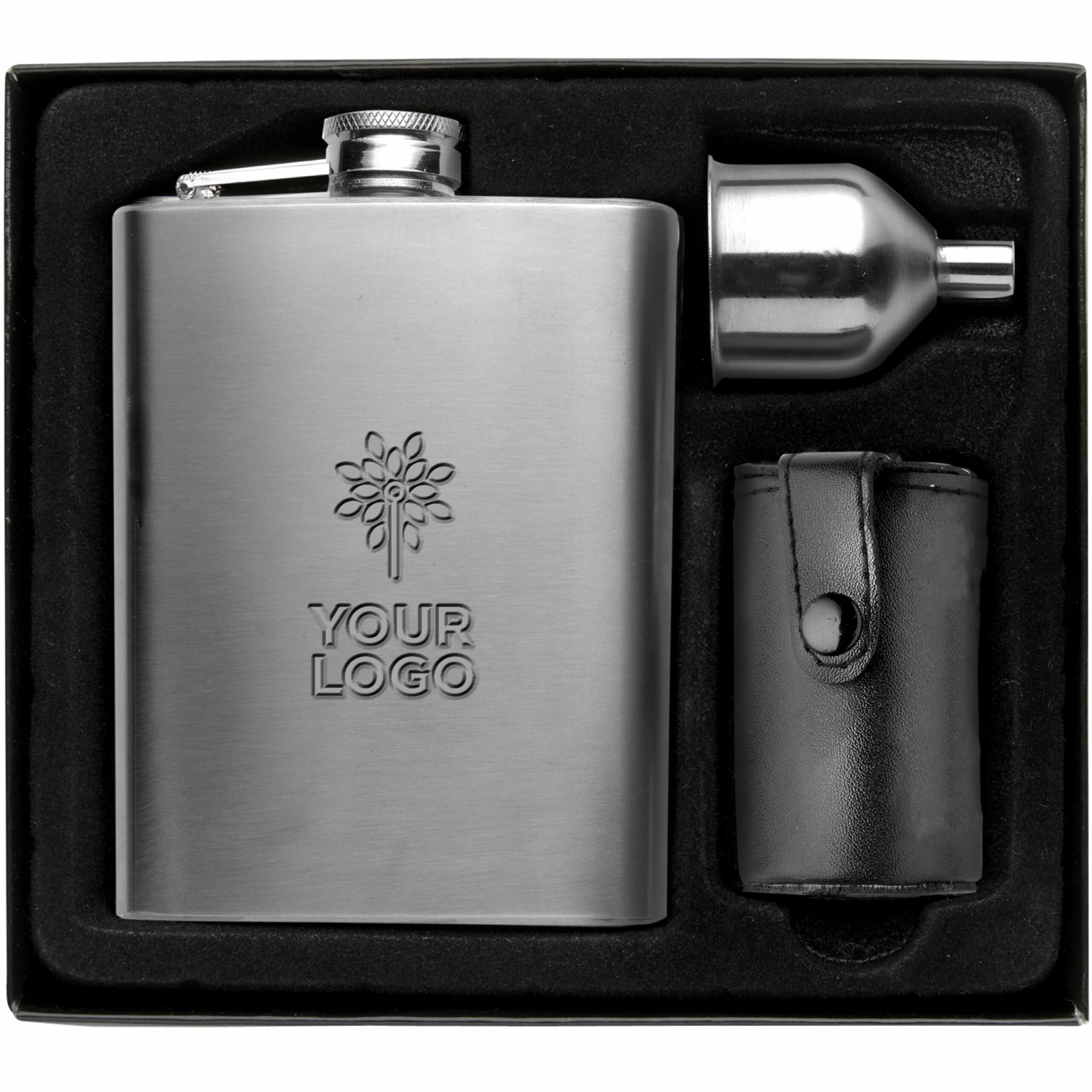 2807 | Petaca (220 ml) con 4 vasitos (30 ml) y embudo de acero inoxidable 304. Presentado en una caja de regalo.