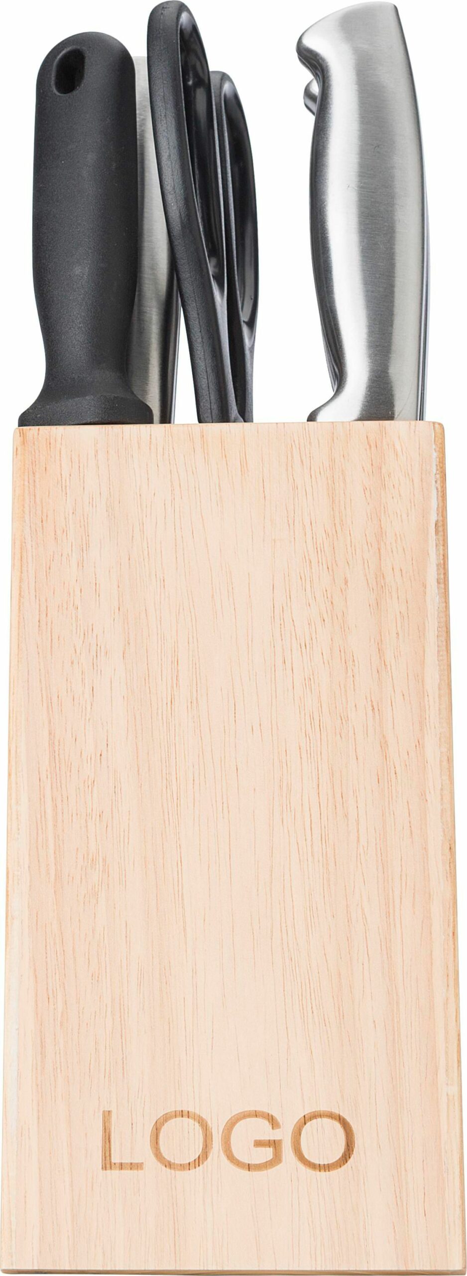 5865 | Tacoma de madera con 14 piezas de acero inoxidable y PP: Tijeras, afilador y once cuchillos diferentes.
