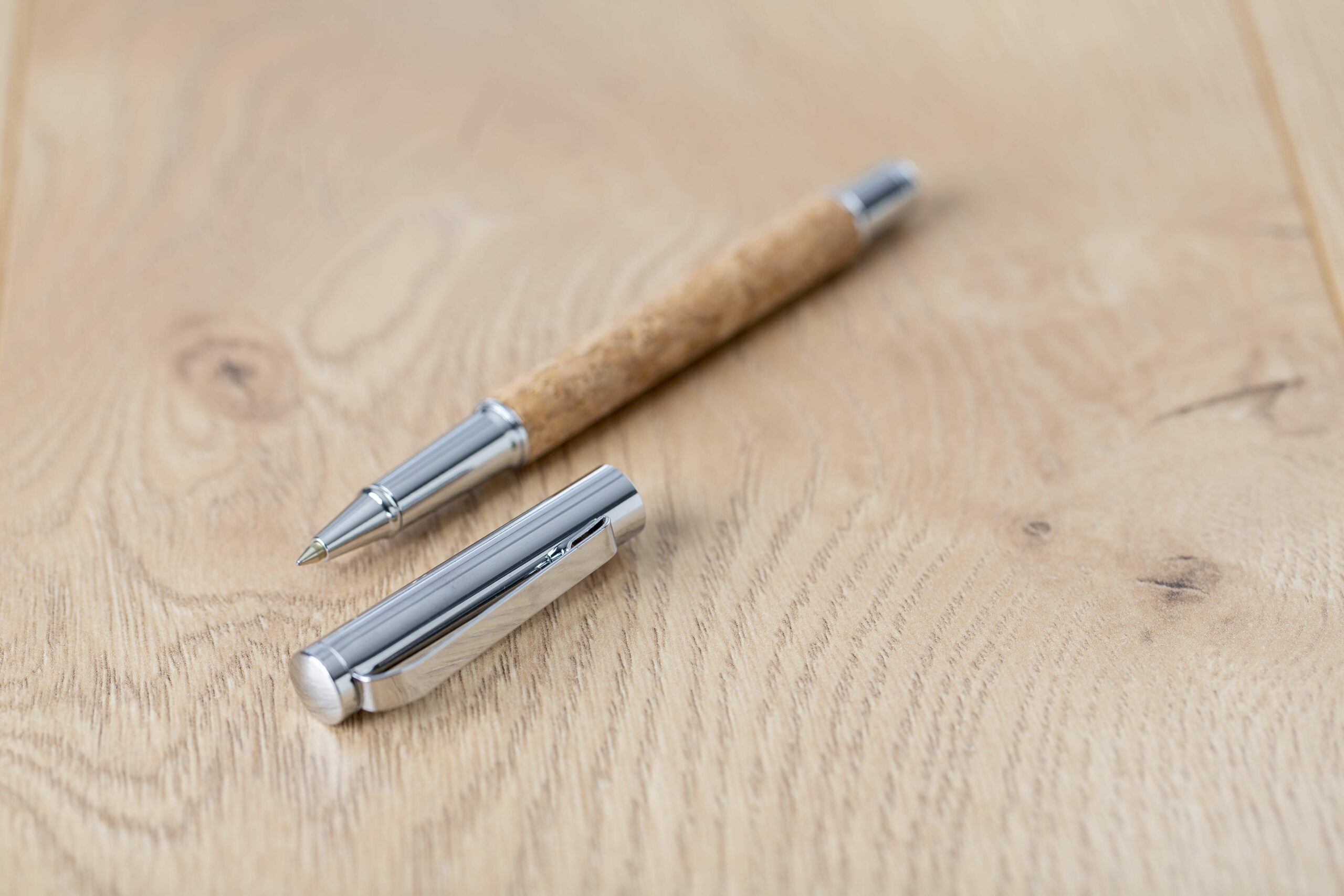 8646 | Set de bolígrafo y roller de corcho y metal cromado. Tinta azul. Presentados en un estuche de corcho con forro de terciopelo.