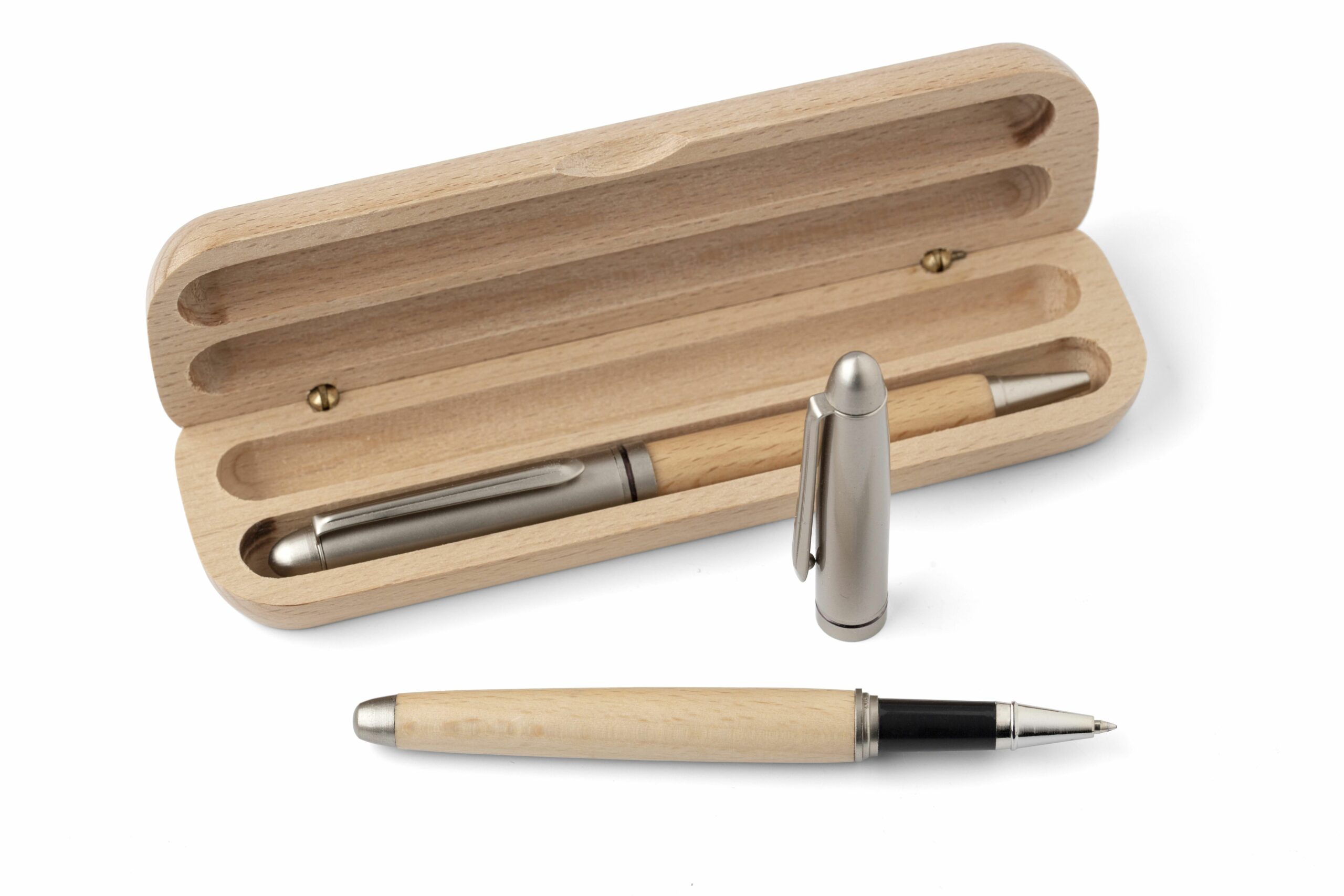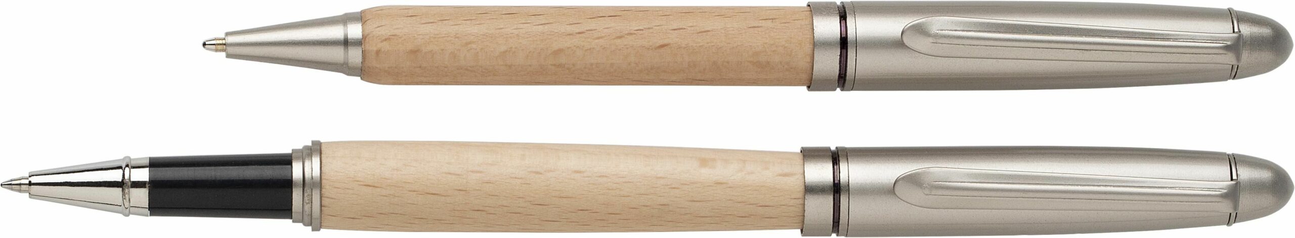 9156 | Bolígrafo y roller de madera de haya con acabados de metal. Tinta azul alemana Dokumental. Presentados en un estuche de madera de haya.