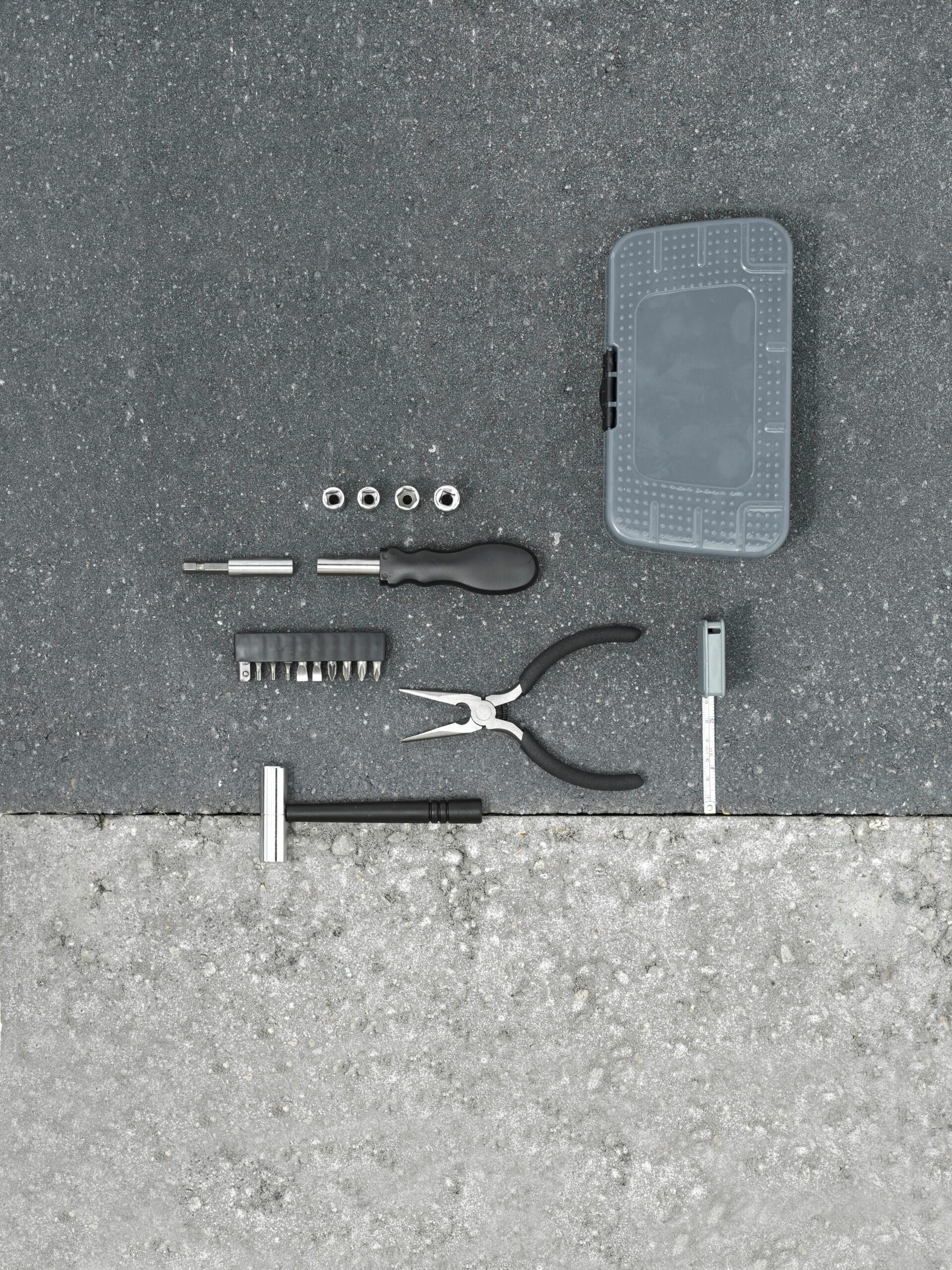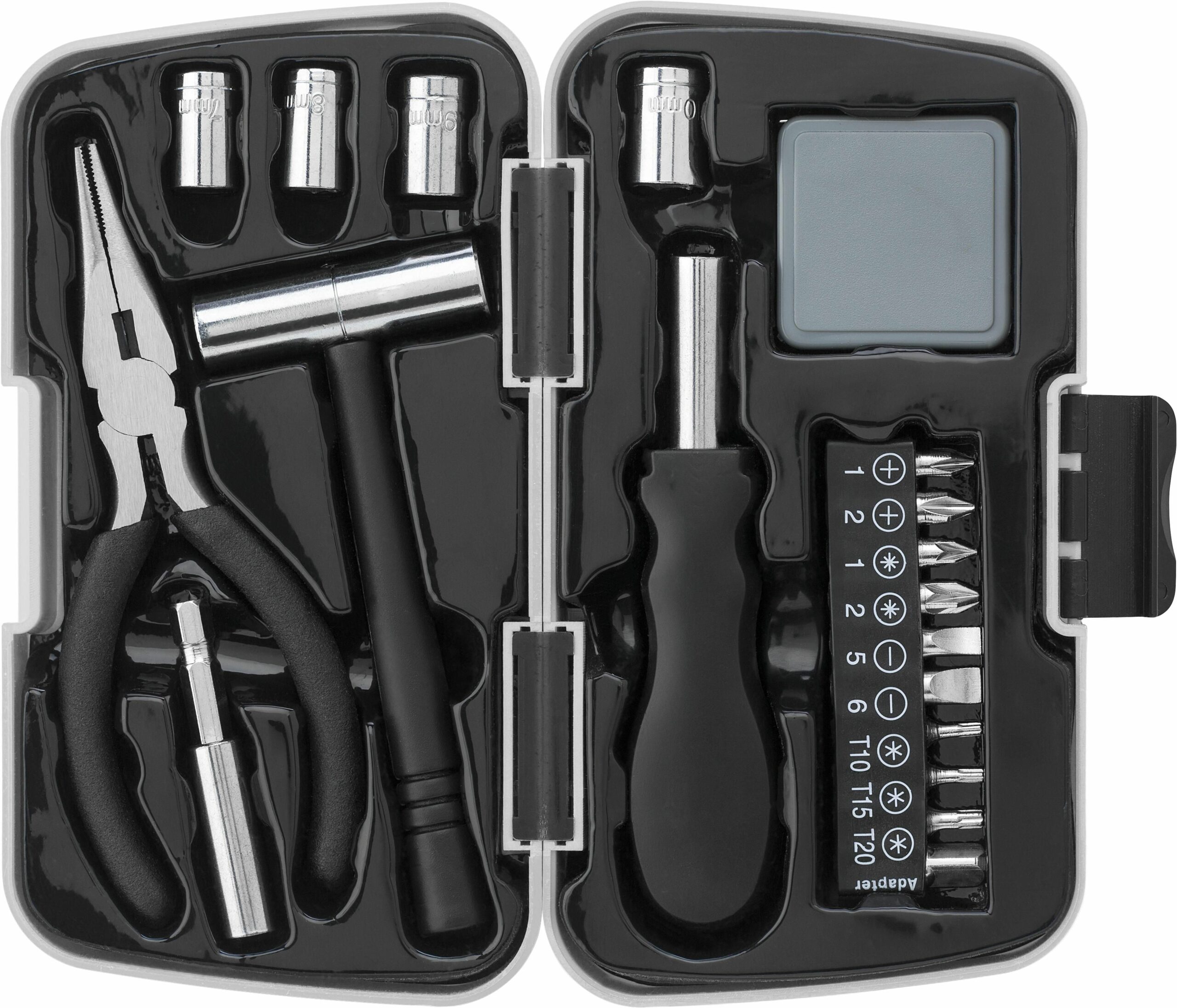 7159 | 19 herramientas de aluminio y metal presentadas en un estuche de plástico.